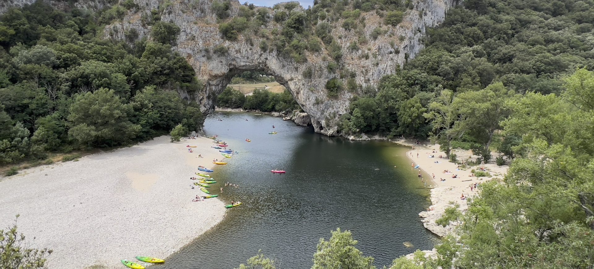 Kurz hinter der Stadt folgen wir dem Lauf der Ardèche, die im Laufe der Erdgeschichte eine der großartigsten Schluchten Europas aus dem Kalkstein gewaschen hat.